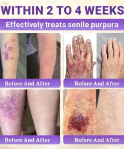 62 éves vagyok, és gyakran nagy lila foltok jelennek meg a combomon, még akkor is, ha nem ütközök semmibe. Egy enyhe érintés vérzést okozhat. Az orvosom azt mondta, hogy az öregedő bőrből és a gyenge erekből származó szenilis purpura. Annyi krémet kipróbáltam már, de semmi sem segített igazán – így nem is vártam sokat.
